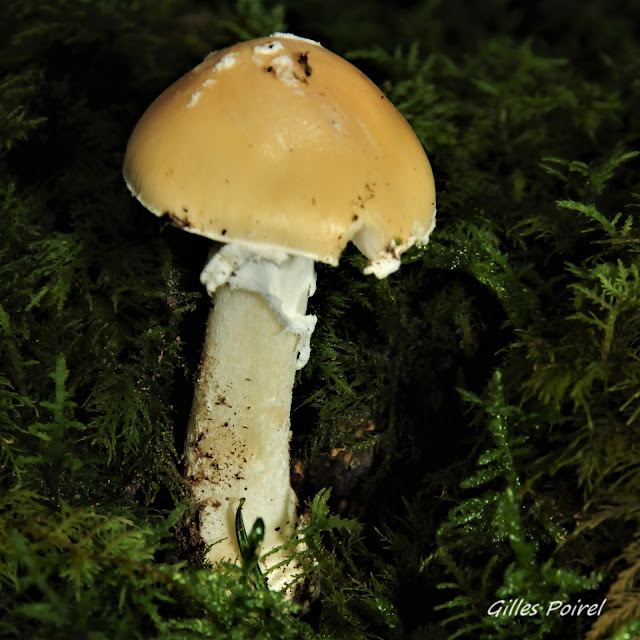 Amanita junquillea. L'Amanite jonquille. Pied, cylindrique, assez trapu, légèrement pelucheux-floconneux. Bois de la Communauté, Larnaud 39140. 2016/10/31. |